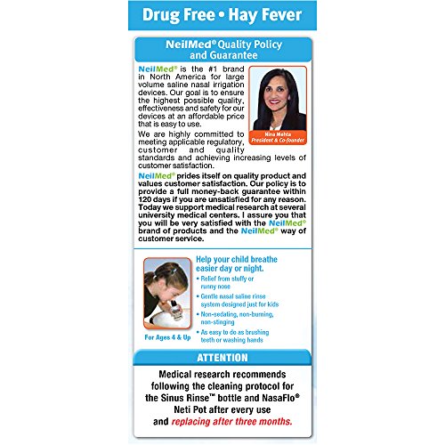 NeilMed Sinus Rinse Pediatric Kit lindert Allergien und Nebenhöhlen-Symptome, Nasenallergien und Trockenheit, Nebenhöhlendruck und Nasenstickigkeit. Hilft auch die Nasensymptome zu lindern, die durch Grippe oder Erkältung verursacht werden. Es hilft, Nasenreizungen durch Berufsstaub, Rauch, Tierschuppen, Gras und Pollen zu lindern.