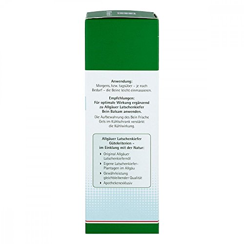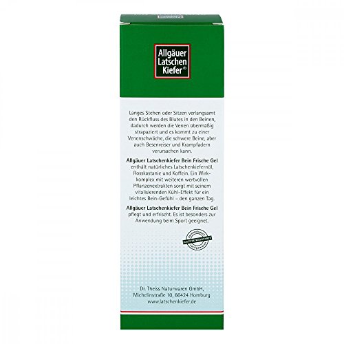 Allgäuer Latschenkiefer Bein Frische Gel 200 ml Der Frischekick am Tag für leichte Beine. Produkteigenschaften: Allgäuer Latschenkiefer Bein Frische Gel enthält natürliches Latschenkiefernöl, kühlendes Menthol und Campher. Ein wWrkkomplex aus weiteren wertvollen Pflanzenextrakten wie der Rosskastanie, rotem Weinlaub und Efeu wirkt erweiterten Äderchen entgegen und unterstützt das Kapillarsystem. Koffein und Algenextrakt unterstützen die Erleichterung der Beine, die durch langes Stehen oder Sitzen belastet werden. Allgäuer Latschenkiefer Bein Fische Gel erfrischt und trägt auf natürliche Weise zur erholsamen Pflege müder, schwerer Beine bei.