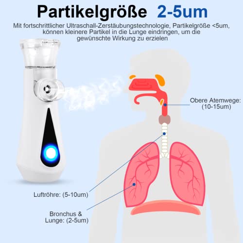 【FORTGESCHRITTENE ZERSTÄUBUNGS TECHNOLOGIE】 Hygelink Inhalator nimmt fortschrittliche Ultraschall-Mikro-Mesh-Schwingmembran-Technologie, zerstäubte Partikel: 2-5um, feine Partikel können besser in die Lunge und Bronchien eindringen. Zerstäubungsrate von 0,2ml/min kann die Inhalationszeit verkürzen, sehr geeignet für Erkältungen, Asthma und Atemwegserkrankungen.