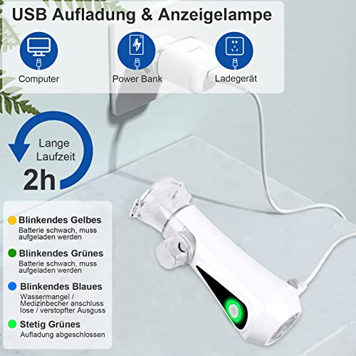 【INTELLIGENTER & LANGLEBIGER】 Inhalator kann bis zu 2 Stunden laufen, und der Inhalator verfügt über eine Flüssigkeitsstandserkennungsfunktion, wenn die Flüssigkeit im Inhalator-Medizinbecher erschöpft ist, hört der Inhalator automatisch auf zu arbeiten, vermeidet leere Flüssigkeitsschwingungen des Mikronetzes und verlängert die Lebensdauer des Inhalators erheblich. Der Vernebler hat auch die Power-Indikator-Funktion, wenn die Leistung niedrig ist, blinkt der Vernebler ein gelbes Licht.