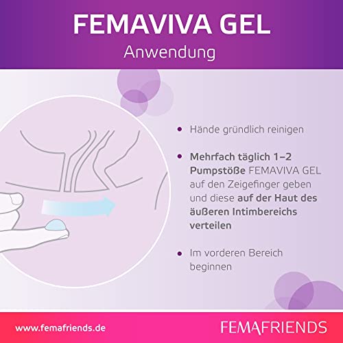 ANWENDUNG: Mehrfach täglich 1-2 Pumpstöße FEMAVIVA Gel auf den Zeigefinger geben und diese auf der Haut des äußeren Intimbereichs verteilen. Im vorderen Bereich beginnen. Gynäkologisch und dermatologisch getestet. Hygienischer Airless Dispenser