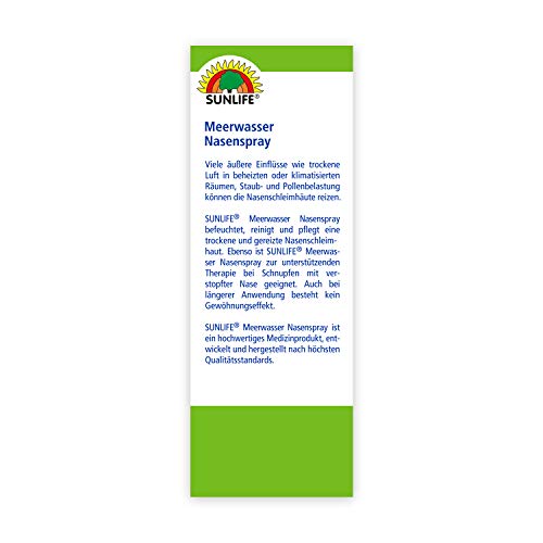 SUNLIFE Meerwasser Nasenspray befeuchtet, reinigt und pflegt eine trockene und gereizte Nasenschleimhaut. Ebenso ist SUNLIFE Meerwasser Nasenspray zur unterstützenden Therapie bei Schnupfen mit verstopfter Nase geeignet.
